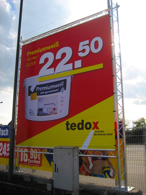 Wir drucken auf einer breiten Palette von Materialien, je nach Anwendung. Hierbei achten wir auf Langlebikeit, Windlast und eine optimale Druckqualität.